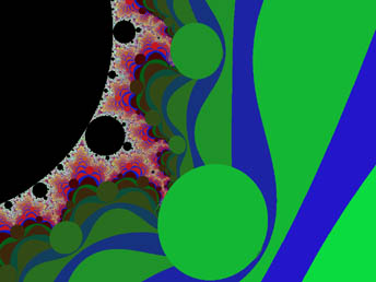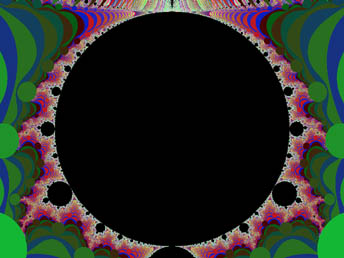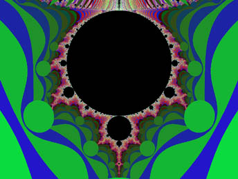 It is notable that the circular band of form around the point (-1, 0i) would touch a perfect circle about that point with a radius of 0.25 at multiple points. This could depict the apparent flatness of our universe, as this term is used by cosmologists. Will the universe expand forever, or collapse back into a ball? At this point; the possibility that our univere will collapse appears extremely unlikely, as the evidence indicates that the universe's expansion is actually accelerating. For a long time, it appeared that a balance between expanding and collapsing forces exists, but now our best evidence says otherwise. Until recently, we only had an approximate idea of the age of the universe, and we still have only a crude estimate of other things, such as the size of the totality of space (not just the observable part), the mass of all the matter in the universe, and other things necessary to accurately determine the final stage of the universe's evolution. When I first wrote about a cosmology based on the Mandelbrot Set, I thought it depicted a big-crunch ending for the universe, but when I read recent predictions about a cold-dead ending, with black-holes trying to swallow up the last remaining bits of matter, I saw a resemblance to those events, as well, in the Mandelbrot Set and its family of associated figures. I now believe there is a new twist to incorporate, and that the real answer may be yet more interesting.